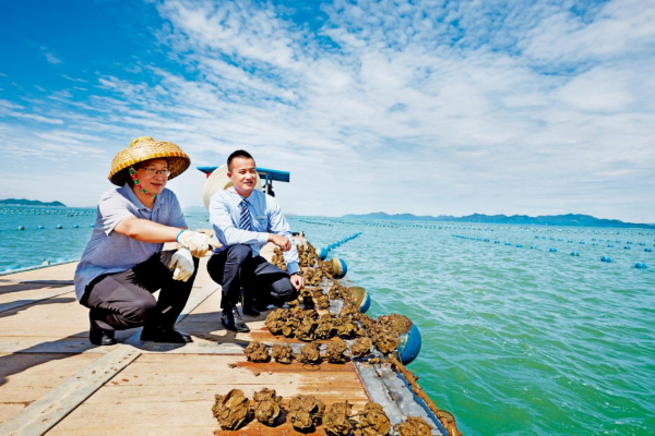 ▲邮储银行责任主谈主员在生蚝海上孳生基地稽查孳生情况