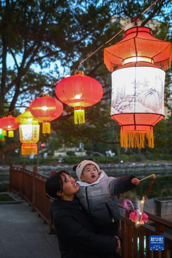1月29日,在嘉兴市秀洲区新塍古镇小蓬莱公园内,东说念主们前来不雅赏“鳌山灯会”的彩灯。