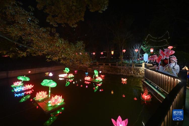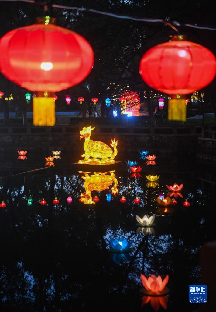 1月29日,在嘉兴市秀洲区新塍古镇小蓬莱公园内,东说念主们在不雅赏“鳌山灯会”的彩灯。
