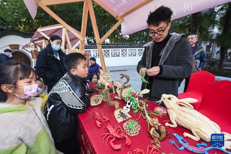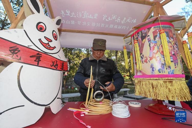 1月29日,在嘉兴市秀洲区新塍古镇小蓬莱公园内,传统艺东说念主(右)在“鳌山灯会”现场展示手工身手。