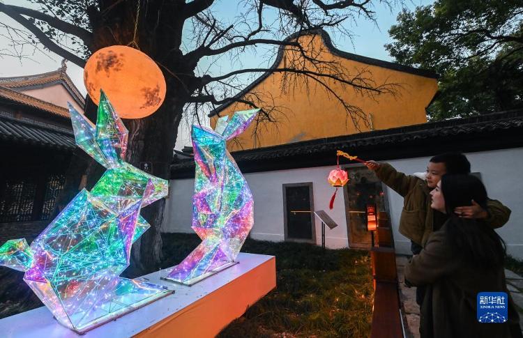 1月29日,在嘉兴市秀洲区新塍古镇小蓬莱公园内,旅客在不雅赏“鳌山灯会”的兔子彩灯。