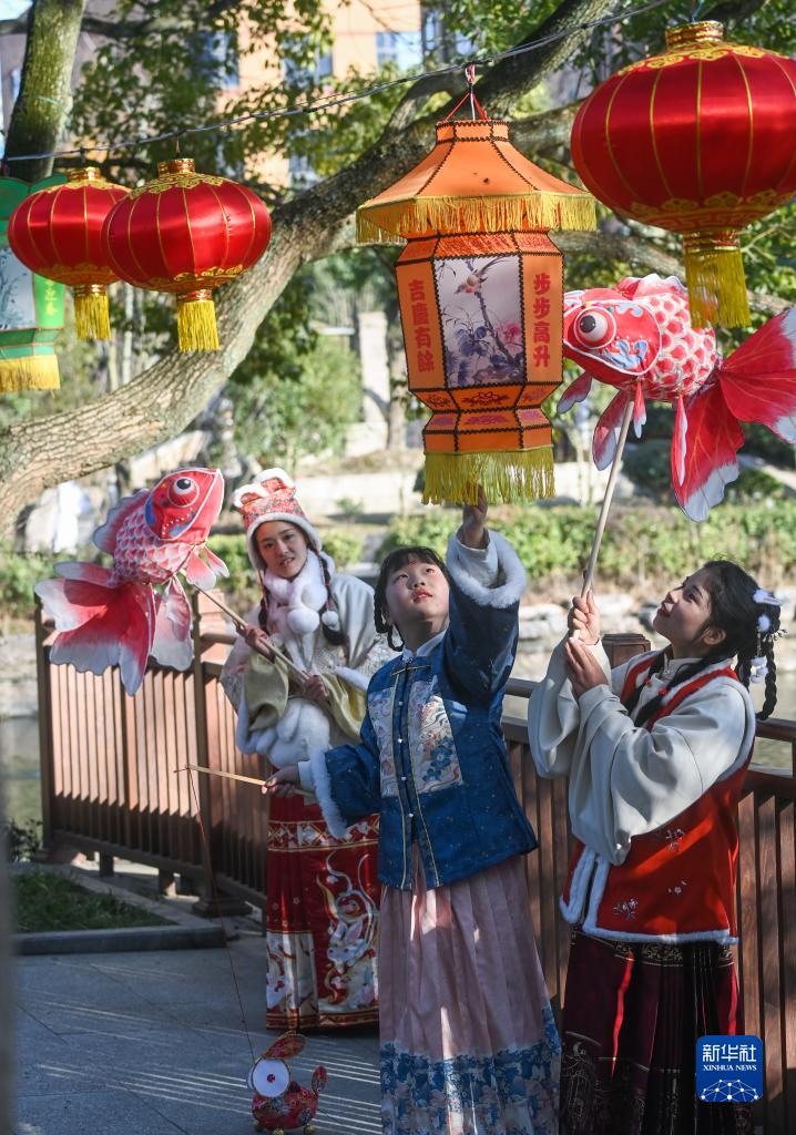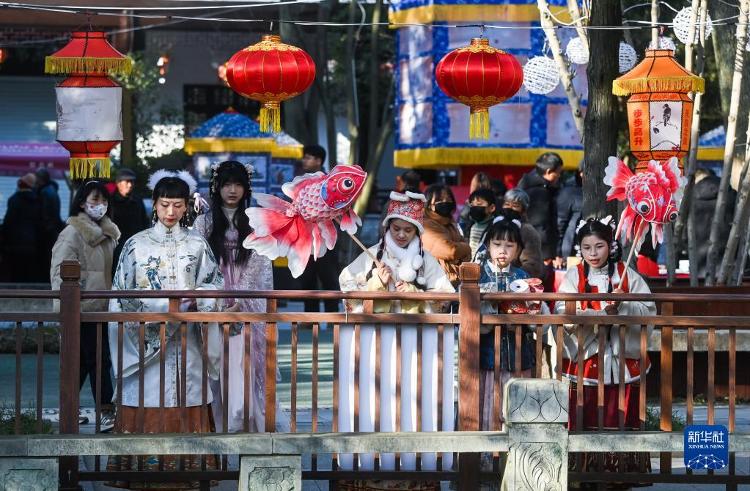 1月29日,在嘉兴市秀洲区新塍古镇小蓬莱公园内,身着传统衣饰的旅客在“鳌山灯会”现场不雅赏花灯。