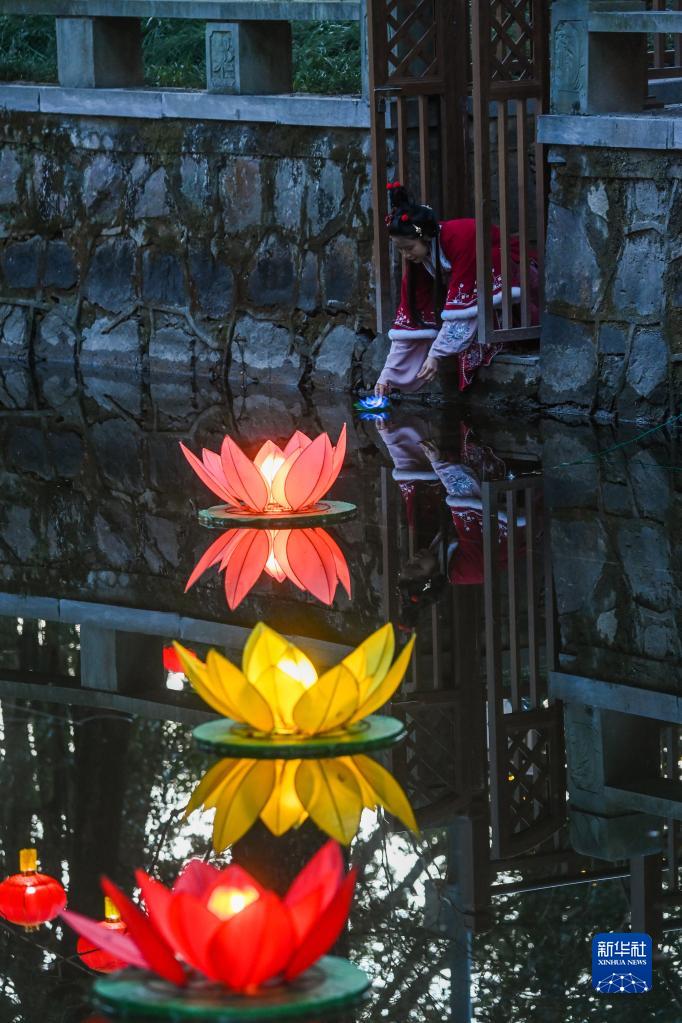 1月29日,在嘉兴市秀洲区新塍古镇小蓬莱公园内,身着传统衣饰的旅客在“鳌山灯会”现场放下“心愿灯”。