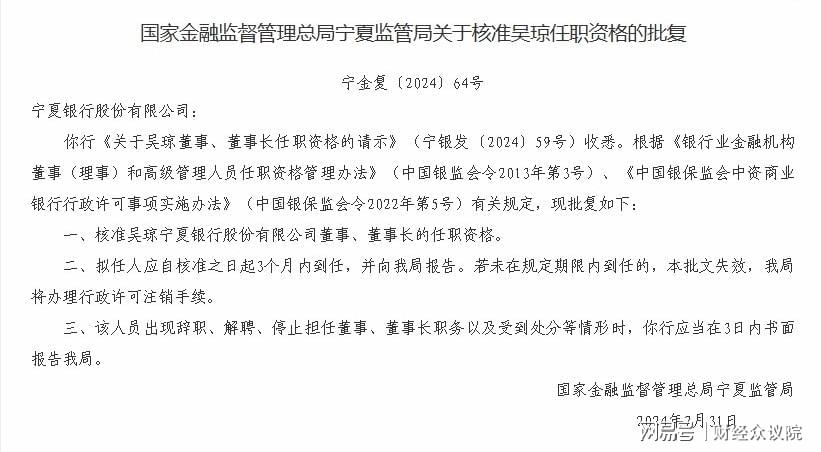 7月31日体育游戏app平台,国度金融监管总局宁夏监管局核准宁夏银行董事长吴琼的任职履历,这位56岁的“空降”董事长认真运行履职。
